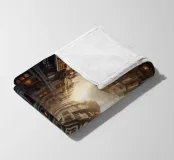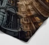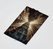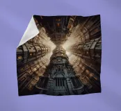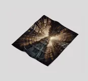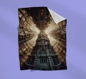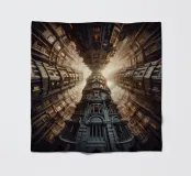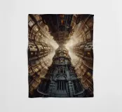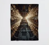 Una rappresentazione surreale di strutture architettoniche simmetriche e torreggianti che convergono verso una luce centrale incandescente. I disegni intricati, l'illuminazione calda e la prospettiva drammatica creano un'immagine impressionante e ultraterrena.