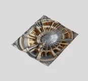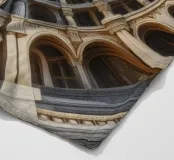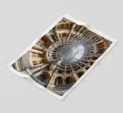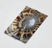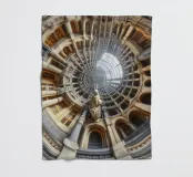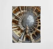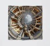 Questa immagine mostra un'intricata architettura circolare con colonne di pietra ornate, una statua centrale e un soffitto di vetro. La prospettiva surreale crea un effetto tunnel, attirando lo sguardo verso il centro della composizione.