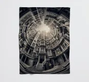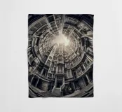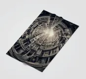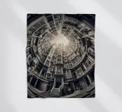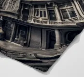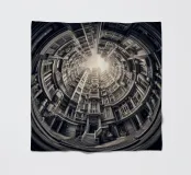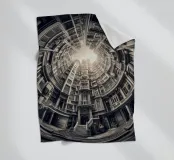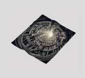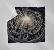Questa immagine mostra una scena architettonica surreale con edifici concentrici disposti circolarmente. I toni monocromatici aggiungono un tocco vintage, mentre il centro illuminato dal sole crea profondità e un'illusione di altezza infinita.