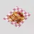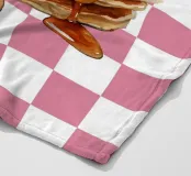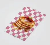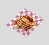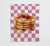 Una pila di pancake è sormontata da fragole e irrorata di sciroppo, su uno sfondo a scacchi bianchi e rosa. I colori vivaci e lo sciroppo lucido creano un aspetto invitante.