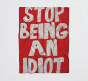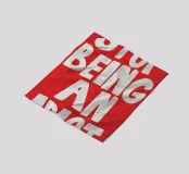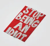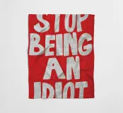 "Il messaggio schietto 'STOP BEING AN IDIOT' (Smetti di essere un idiota) viene visualizzato in grassetto, con una tipografia bianca leggermente irregolare su uno sfondo rosso solido, creando un senso di urgenza e di immediatezza. Il design semplice e i colori contrastanti amplificano l'impatto dell'affermazione",
