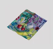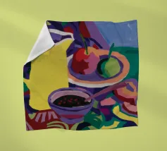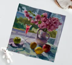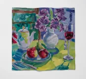 Composizione di natura morta con una teiera d'argento, una tazza da tè, una ciotola di frutta (mele, uva) e un bicchiere di vino rosso su una tovaglia bianca. Lo sfondo è di un fresco blu-verde. Lo stile enfatizza la forma e il riflesso.