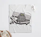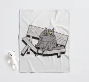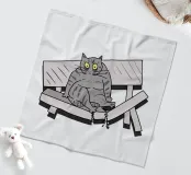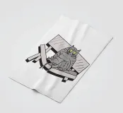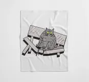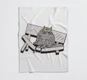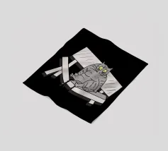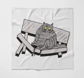 Un disegno divertente mostra un gatto grigio seduto su una panchina rotta nel parco. L'illustrazione ricrea la scena con un tocco comico, esagerando l'espressione del gatto. È come se il peso del gatto avesse causato l'incidente, creando una scena divertente e ironica.