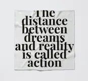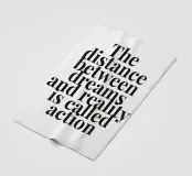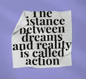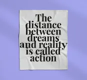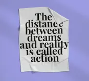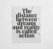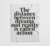 "Le parole 'La distanza tra i sogni e la realtà si chiama azione' sono disposte in un layout tipografico di grande impatto visivo, che sottolinea il potere di agire per raggiungere gli obiettivi. Il testo è audace e d'impatto, su uno sfondo pulito e minimalista, che crea un senso di motivazione e determinazione",