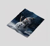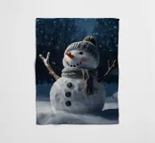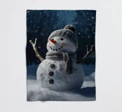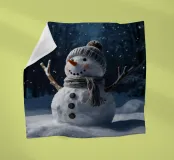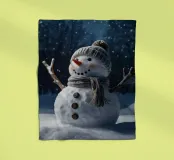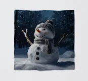 Un pupazzo di neve adornato con un cappello e una sciarpa si gode la serena bellezza di una foresta innevata al chiaro di luna, circondato da fiocchi di neve che cadono.