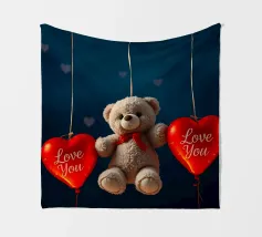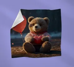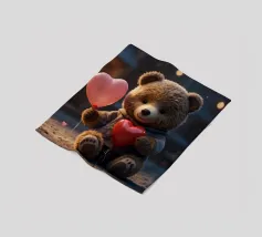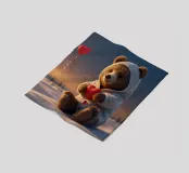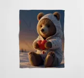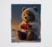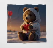 Un simpatico orsacchiotto vestito con un'accogliente felpa con cappuccio siede nella neve, tenendo gioiosamente un cuore rosso mentre un palloncino si muove nell'aria fresca della sera sotto un tramonto colorato.