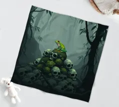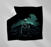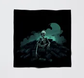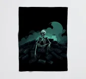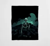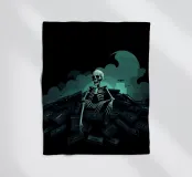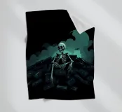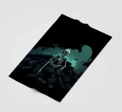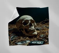 Uno scheletro reclinato in mezzo a una pila di cassette vintage, circondato da una nebbia spettrale e da sagome inquietanti, che evocano un'atmosfera nostalgica e agghiacciante, perfetta per Halloween.
