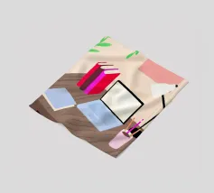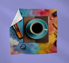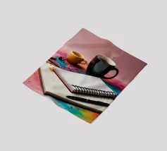 Un vivace spazio di lavoro mostra un quaderno a righe ornato da un fiore rosa, circondato da carte colorate e materiale artistico, che invita alla creatività e all'ispirazione.