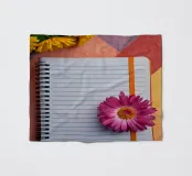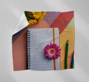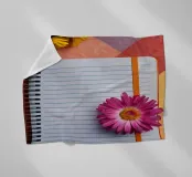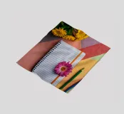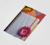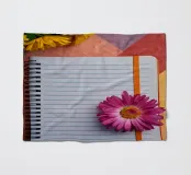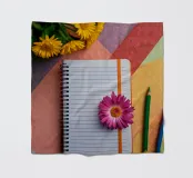 Un vivace spazio di lavoro mostra un quaderno a righe ornato da un fiore rosa, circondato da carte colorate e materiale artistico, che invita alla creatività e all'ispirazione.