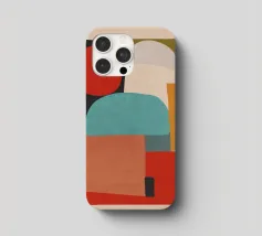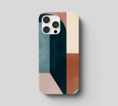 Forme geometriche e tonalità della terra creano un design moderno con linee e forme astratte. La composizione comprende rettangoli sovrapposti e un semicerchio, evidenziati da accenti dorati.
