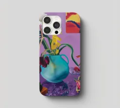 Un vaso blu turchese brillante racchiude un rigoglioso bouquet di fiori viola, rosa e rossi, disposti in modo drammatico su una superficie zebrata su uno sfondo rosso intenso.