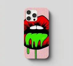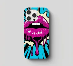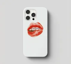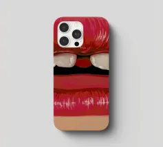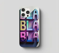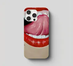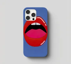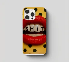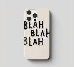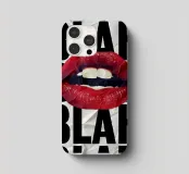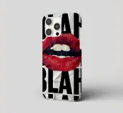 "Un paio di labbra rosse, lucide e vibranti, posizionate tra le parole 'BLAH' impilate verticalmente in una tipografia nera e audace su uno sfondo bianco e pulito, creano una dichiarazione giocosa e sprezzante. Il contrasto tra le labbra realistiche e il testo grafico aggiunge un tocco pop art.",