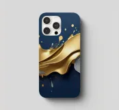 Una composizione astratta che mostra onde dinamiche di oro e argento, intrecciate con spruzzi vibranti su uno sfondo blu profondo, ideale per sfondi desktop e sfondi artistici.