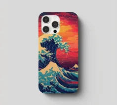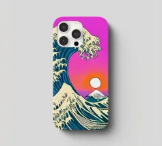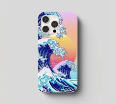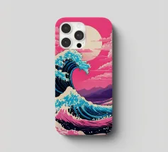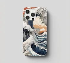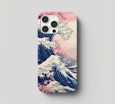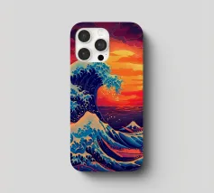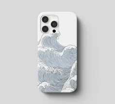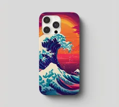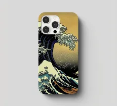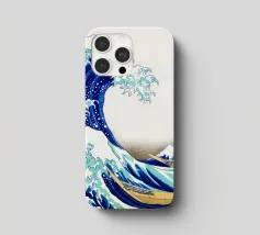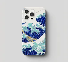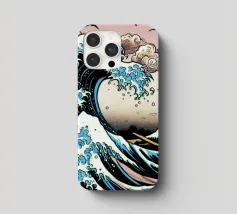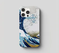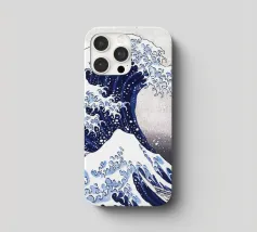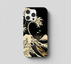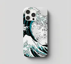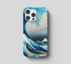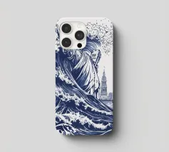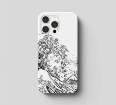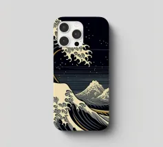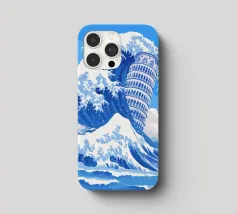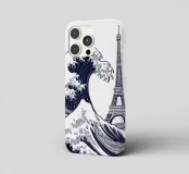 L'immagine raffigura un'illustrazione stilizzata in bianco e nero della Grande Onda al largo di Kanagawa, una famosa xilografia giapponese, con la Torre Eiffel sovrapposta all'onda. L'onda è raffigurata in un movimento dinamico e vorticoso, con creste spumeggianti e una base blu intenso. La Torre Eiffel si erge alta e slanciata, con la sua struttura intricata che contrasta con la forma organica dell'onda.
