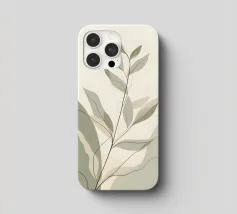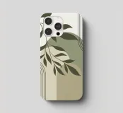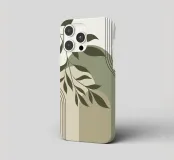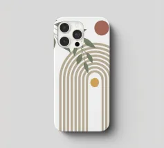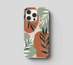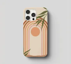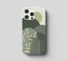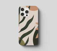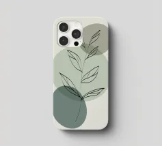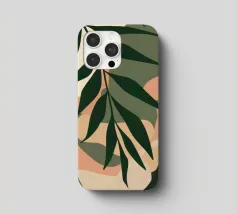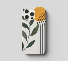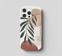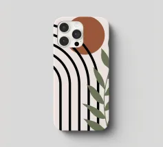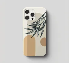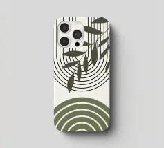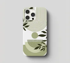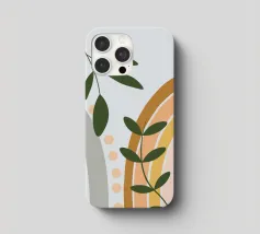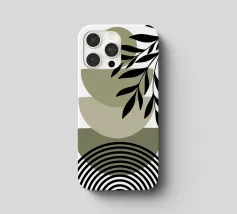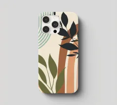 Un ramo di foglie si sovrappone a forme geometriche, tra cui linee arcuate e toni sfumati e stratificati. La combinazione crea un connubio armonioso tra natura e design astratto.