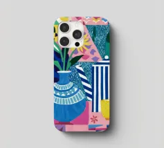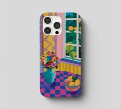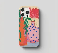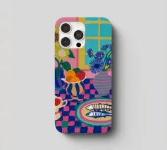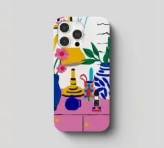 Una natura morta moderna ed eclettica con un paralume a scacchi, un vaso a zig zag e un fiore stilizzato. I motivi e le forme audaci creano una composizione divertente, grafica e di grande stile.