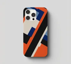 Forme geometriche astratte formano una composizione con audaci linee diagonali che si intersecano in vari angoli. La tavolozza è composta da toni tenui, tra cui nero, grigio, beige e ruggine.