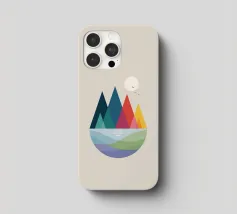 Le forme geometriche formano un paesaggio montano minimalista, con un cerchio in alto che ricorda il sole. Sotto è raffigurato un riflesso invertito delle cime, che crea un disegno simmetrico.