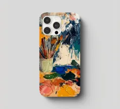 Un vivace barattolo di pennelli si trova alla luce del sole su un tavolo da studio, traboccante di potenziale artistico.