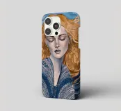 Un delicato ritratto di donna con fluenti capelli biondi o castano chiaro, con gli occhi chiusi o lo sguardo rivolto verso il basso, che indossa un abito blu e argento o bianco dai dettagli intricati che suggeriscono pizzi o armature.