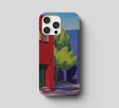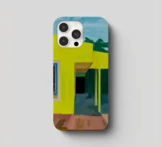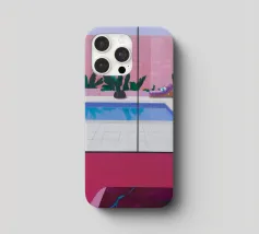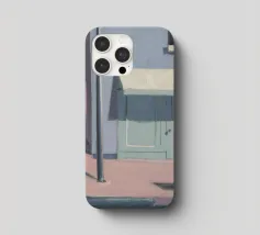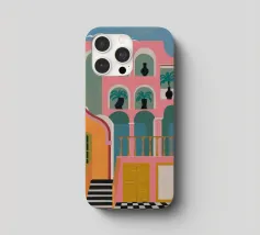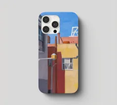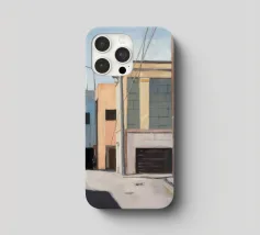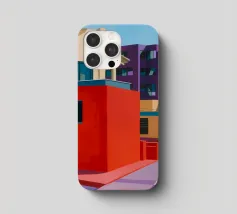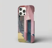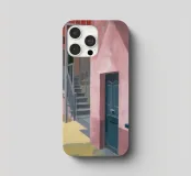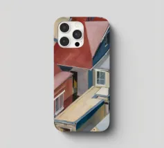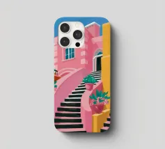 Una complessa scena urbana è resa con un'attenzione particolare alle forme geometriche e a un'audace tavolozza di colori rosa, verde acqua e rosso. Una scala esterna fornisce un forte elemento compositivo, guidando l'occhio attraverso le forme architettoniche astratte.