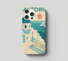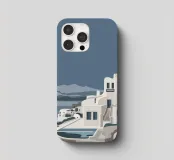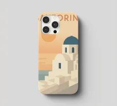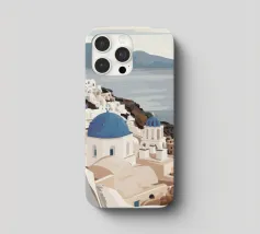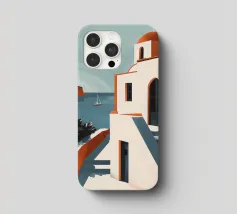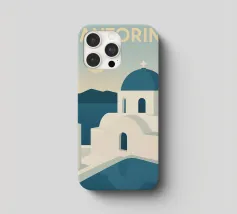 Una rappresentazione minimalista dell'iconica architettura imbiancata di Santorini, in Grecia, sotto un cielo calmo e crepuscolare, che trasmette un profondo senso di pace, tranquillità e bellezza senza tempo.