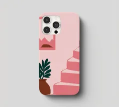 Una scena d'interni stravagante e astratta con una scala rosa, piante in vaso e un sole e una luna nel cielo visti attraverso un arco. L'opera d'arte è un paesaggio da sogno giocoso e bohémien.