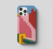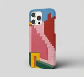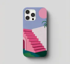 Un'opera architettonica di grande effetto, con una lunga scala rosa che sale verso un sole o una luna gialli e luminosi in un cielo blu scuro. La composizione è audace, minimalista e fortemente simbolica.