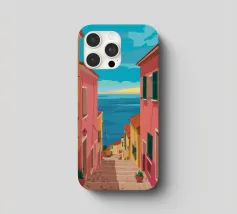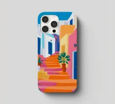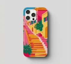 Una vista mozzafiato su una vibrante scalinata mediterranea, fiancheggiata da edifici colorati e palme rigogliose. La prospettiva attira lo sguardo verso l'alto, verso un cielo luminoso, creando un senso di ottimismo, avventura e il sogno di una perfetta fuga estiva.