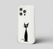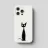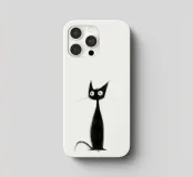 Illustrazione minimalista in bianco e nero di un elegante gatto nero con occhi esageratamente grandi e lineamenti abbozzati. Il disegno astratto e stravagante del gatto aggiunge un tocco artistico e giocoso.