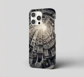 Questa immagine mostra una scena architettonica surreale con edifici concentrici disposti circolarmente. I toni monocromatici aggiungono un tocco vintage, mentre il centro illuminato dal sole crea profondità e un'illusione di altezza infinita.