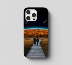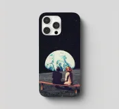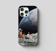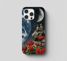 Vivevamo lì. Ricordate? Quel mondo ci sta ancora aspettando. ~ Coppia seduta su una panchina che guarda la Terra surreale retro futuristico stellato composizione romantica. versione orizzontale