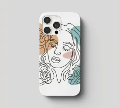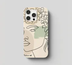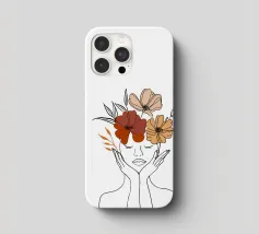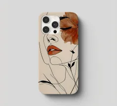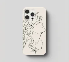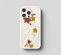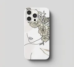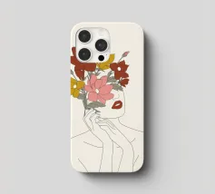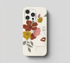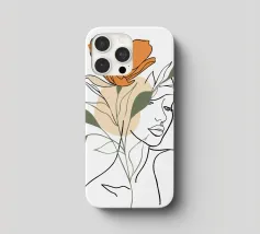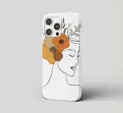 Un disegno al tratto minimalista raffigura il profilo di una donna dall'espressione serena. I suoi capelli sono ornati da grandi fiori stilizzati di colore arancione e giallo e da foglie delicate.