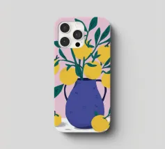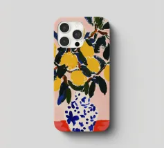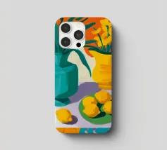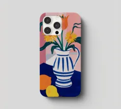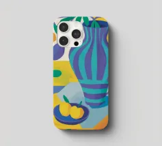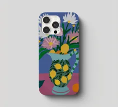 Un vivace bouquet di fiori e agrumi si trova in un vaso blu su un tavolo rosa. Lo sfondo è un mix dinamico di motivi a zig zag in bianco e nero e foglie verdi, che creano una natura morta moderna e giocosa.