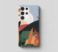 A modern abstract composition of various stylized botanical shapes and leaves in a palette of terracotta, beige, and dark blue against a light background.