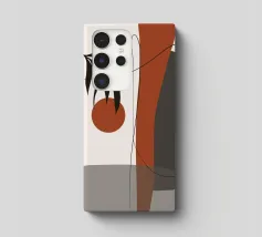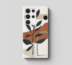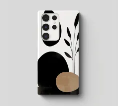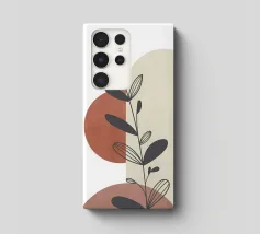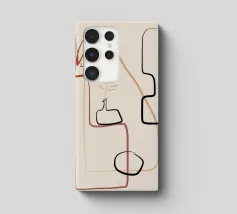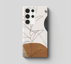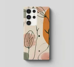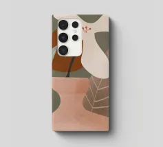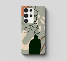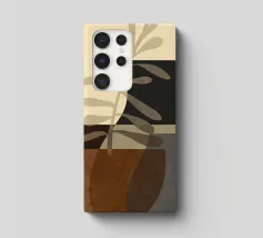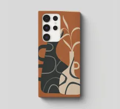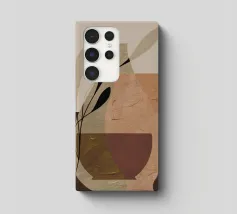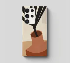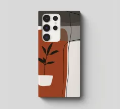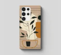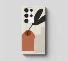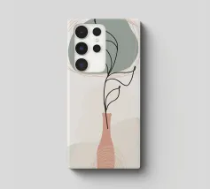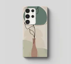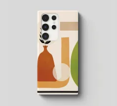 Linee astratte e blocchi di colori tenui creano una composizione moderna dall'estetica minimalista. La forma stilizzata di una pianta e quella semplice di un vaso aggiungono elementi organici, in contrasto con le forme geometriche.