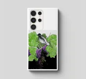 Un uccello è appollaiato su un ramo con grappoli d'uva viola circondati da foglie verdi. I colori vivaci dell'uva e delle foglie creano un contrasto sorprendente.