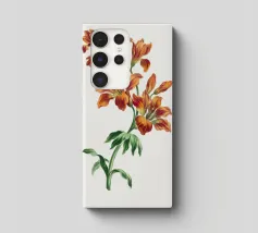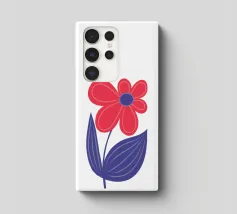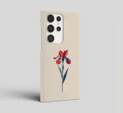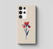 Un'illustrazione splendidamente dettagliata di un fiore di iris rosso e blu su uno sfondo chiaro, che mostra petali vibranti e sfumature morbide e naturali. Il grazioso stelo e le foglie ne esaltano il fascino artistico.