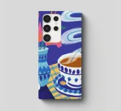 Illustrazione stravagante di una tazza di caffè fumante in una tazza a scacchi blu e bianchi, con fiori stilizzati che fluttuano sopra di essa, su uno sfondo blu scuro e ondulato.