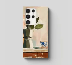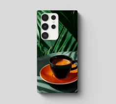 Una natura morta semplice e lunatica di una tazza di caffè nero accanto a una pianta di monstera in vaso. L'illuminazione scura e d'atmosfera crea una scena mattutina sofisticata, calma e contemplativa.