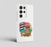 Un capibara rilassato con gli occhiali da sole si sdraia su una spiaggia con un drink tropicale e un vibrante tramonto sullo sfondo. La frase "Chill Vibes Only" è ben visibile accanto al capibara.