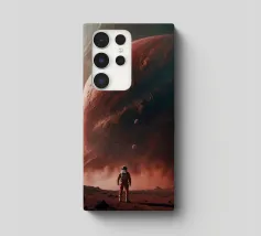 Questa illustrazione digitale cattura l'audace discesa di due coraggiosi paracadutisti su un paesaggio desertico rosso e alieno. Il terreno sottostante è una vasta e arida distesa di dune di sabbia cremisi.