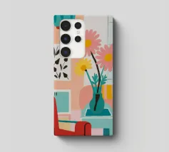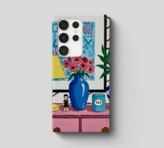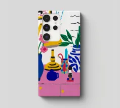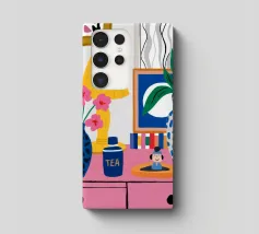 A quirky desk with pink lamp, vase flowers, matryoshka, and tea brings playful personality.