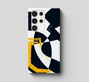 Forme astratte in nero, bianco e oro creano una composizione dinamica con curve fluide e angoli acuti. Il gioco di colori aggiunge profondità e movimento, suggerendo un senso di energia e contrasto.