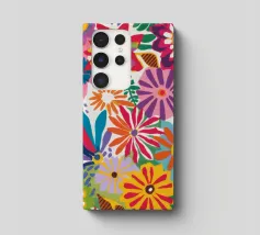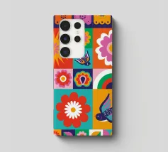A vibrant patchwork of different patterns and motifs, combining floral elements, abstract shapes, and tiled designs. The eclectic mix of colors and styles creates a visually rich and joyful composition, reminiscent of a Mediterranean tile wall.