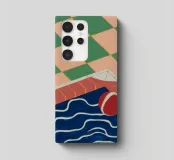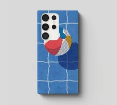 A modern, abstract depiction of a swimming pool with green checkered tiles. A red ball floats on the water, creating a sense of a quiet, sun drenched moment of leisure.