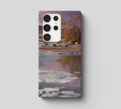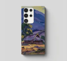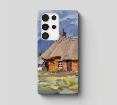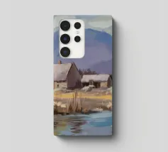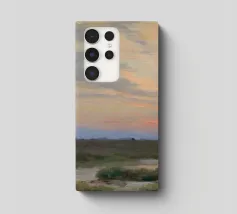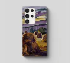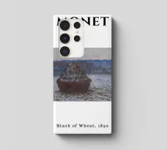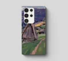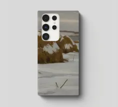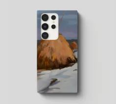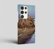 Un dipinto di paesaggio con un grande pagliaio in un campo vicino a un fiume o a uno specchio d'acqua tranquillo. Il cielo è di un grigio tenue e coperto, e la tavolozza generale è sobria con toni terrosi.