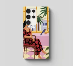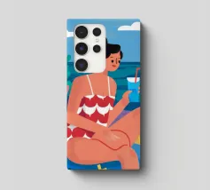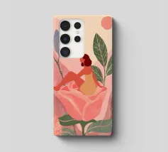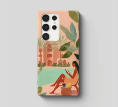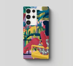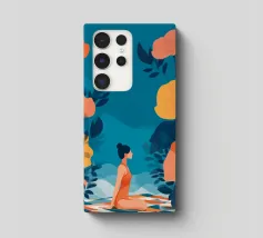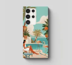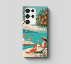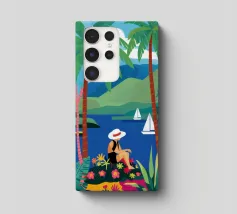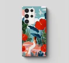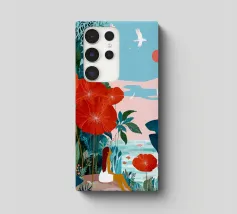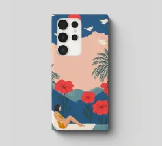 Tra imponenti papaveri corallini e palme piumate, una donna si sdraia pacificamente sotto un audace sole rosso, galleggiando su una pozza di quiete. Uccelli bianchi si librano in un cielo da sogno, facendo eco all'immobilità della sua posa. La scena, sullo sfondo di ricche montagne indaco e di un cielo color mandarino, cattura un'armonia surreale tra la natura e il sé, un momento sospeso in cui il tempo fiorisce e il pensiero si dissolve nel colore e nella calma.