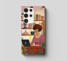 A person works on a laptop surrounded by books, papers, and decorative elements. Plants and a warm ambiance enhance the productive environment.