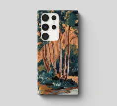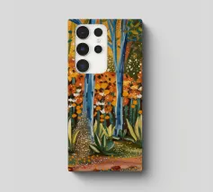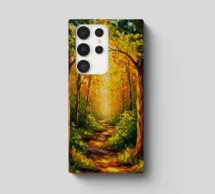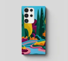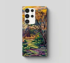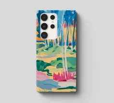 Un paesaggio espressivo e pittorico di un sentiero lungo un ruscello che scorre in una foresta. I vibranti blu, verdi e gialli creano una rappresentazione dinamica, bella e leggermente astratta di una passeggiata nella natura.